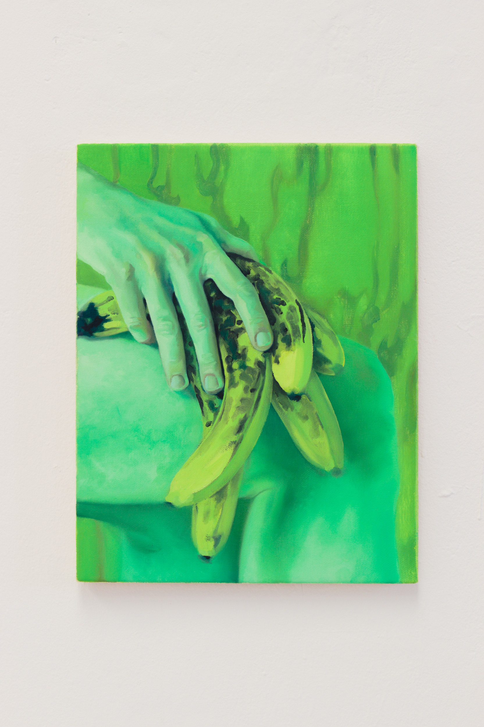 In her new series of works, most of which are surprisingly painterly given her exclusively sculptural focus, Linda Morell processes her own surprise at the banana’s form before its domestication. The banana – a humorous sexual metaphor – and yet it has been stripped by man of its own capacity for sexual reproduction. The seeds inside the fruit unnecessarily took the place of the sweet flesh and had to give way to our vision of a healthy natural snack. Imagining a healthier self, we reach for seedless fruits in the supermarket and guaranteed organic supplements in the pharmacy to give us more energy for our stressful lives and to relieve our environmental grief. In the context of the theory of the chemical Anthropocene, Linda inquires herself about the meaning of the glorification of health, “clean” raw materials in a polluted world, and explores the possibilities of rearranging plant and human life forms.