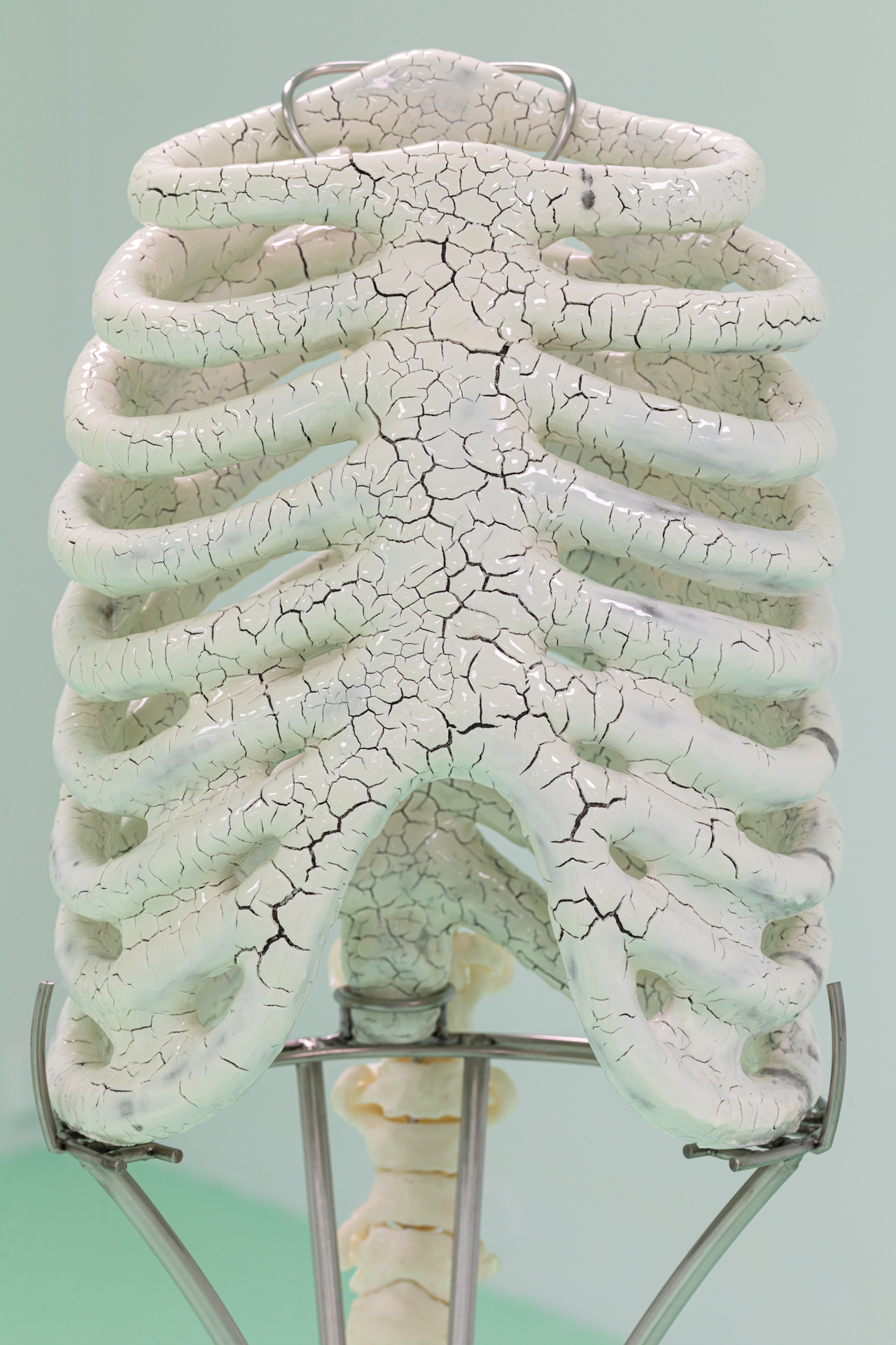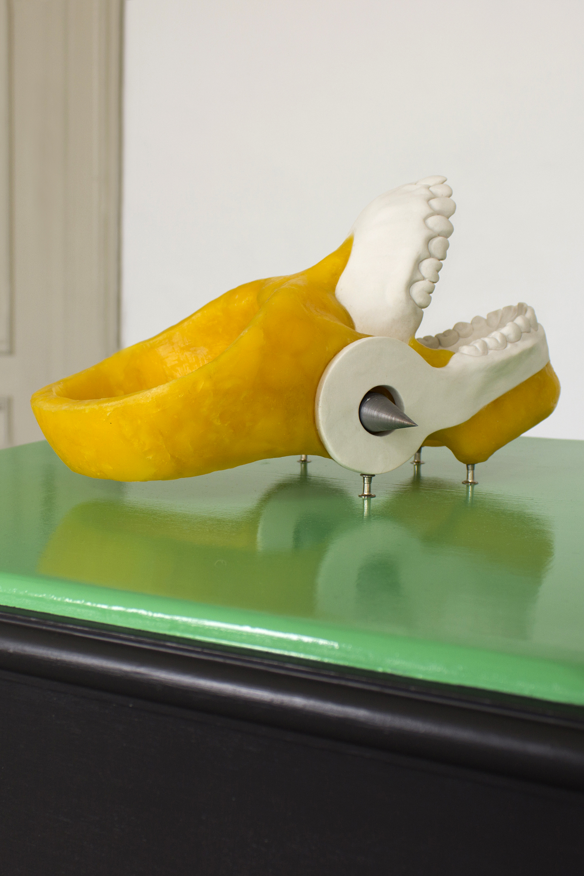 In her new series of works, most of which are surprisingly painterly given her exclusively sculptural focus, Linda Morell processes her own surprise at the banana’s form before its domestication. The banana – a humorous sexual metaphor – and yet it has been stripped by man of its own capacity for sexual reproduction. The seeds inside the fruit unnecessarily took the place of the sweet flesh and had to give way to our vision of a healthy natural snack. Imagining a healthier self, we reach for seedless fruits in the supermarket and guaranteed organic supplements in the pharmacy to give us more energy for our stressful lives and to relieve our environmental grief. In the context of the theory of the chemical Anthropocene, Linda inquires herself about the meaning of the glorification of health, “clean” raw materials in a polluted world, and explores the possibilities of rearranging plant and human life forms.